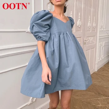 OOTN Square Neck Sexy Summer Mini Dress Short Sleeve Female High Waist Black Loose A Line Women Dress Puff Sleeve Blue Cotton