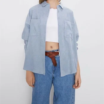 TRAF Women 2020 Fashion Corduroy With Pockets Loose Asymmetrical Blouses Vintage Long Sleeve Button-up Female Shirts Streetwear