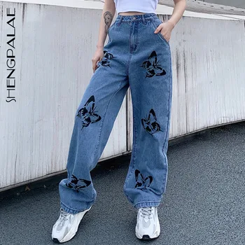 SHENGPALAE 2021 New Summer Vintage Jeans Woman Long Trousers Cowboy Female Loose Streetwear Butterfly Print Pants ZA4110