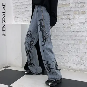 SHENGPALAE 2021 New Summer Fashion Ins Street Hip-hop Printing Wash Jeans Loose Casual Denim Wide Leg Pants Tide Woman ZA4395