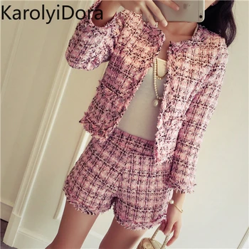 Women’s suit 2020 Spring Tweed 2 Piece Set Women Slim Plaid Short Set Fashion Fringed Trim Jacket Coat + Tassels Short Suit