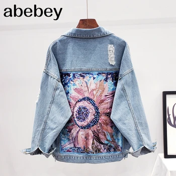 Streetwear Style Print Women’s Denim Jacket Coat Diamonds Hole BF Jeans Outwear Female Spring Autumn Casual Loose Cowboy Outwear