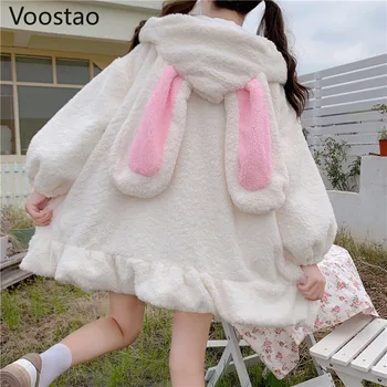 Japanese Style Autumn Winter Women Sweet Warm Jacket Kawaii Soft Lambswool Ruffles Rabbit Ears Hooded Coats Girls Parkas Outwear