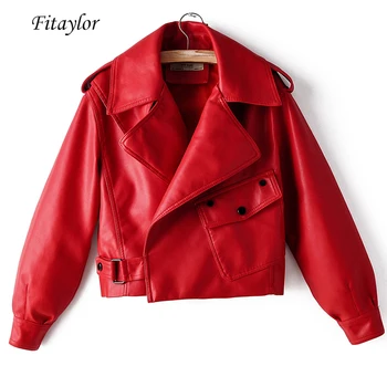 Fitaylor New Autumn Women Faux Leather Jacket Pu Motorcycle Biker Red Coat Turndown Collar Loose Streetwear Black Punk Outerwear