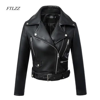 FTLZZ New Women Autumn Winter Black Faux Leather Jackets Zipper Basic Coat Turn-down Collar Motor Biker Jacket With Belt