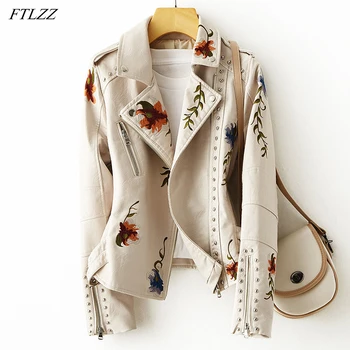 FTLZZ New Women Retro Floral Print Embroidery Faux Soft Leather Jacket Coat Turndown Collar Pu Moto Biker Black Punk Outerwear