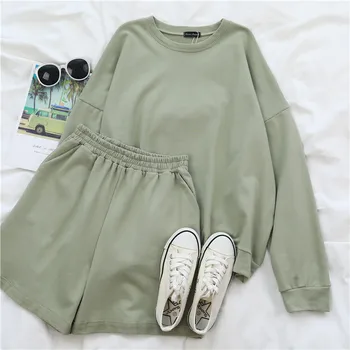 Womens Tracksuits 2 Piece Set Summmer Autumn Oversize Sweatshirt + Sporting Shorts Sweat Set Two Piece Outfit Solid Color Sets