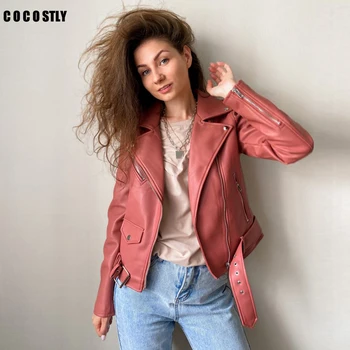 Spring Autumn Women Faux Leather Jacket Ladies Solid With Belt Zipper Biker Coat Female Casual Outwear