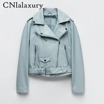2021 New Spring Autumn Women Blue Faux Leather Jacket Ladies Solid With Belt Zipper Biker Coat Female Casual Outwear Veste Femme