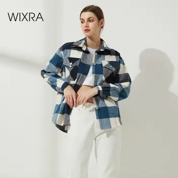 Wixra Womens Plaid Shirt Jacket Coat Ladies Pockets Thick Turn Down Collar Plus Size Female Outerwear