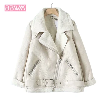 Za Fur Long Sleeved Loose Belt Warm Women’s Jacket Lamb Wool Winter Thickened Locomotive Lapel Female Coat Beige Black Chic PU
