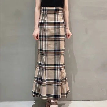 Kuzuwata High Waist Plaid Buttocks Side Split Mermaid Skirts Japan Style Temperament Elegant Jupe 2021 Autumn New Women Faldas