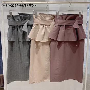 Kuzuwata 2021 Autumn New Jupes Japan Style Sweet Faldas Solid Plaid High Wasit Button Belted Folds Front Slit Women Hip Skirts