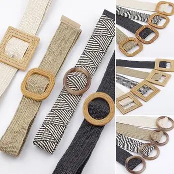 Women Wide Braided Elastic Belt for Dress Round Bamboo Buckle Casual Fashion Girdle Wood Jade Buckle Fake Straw Waistband