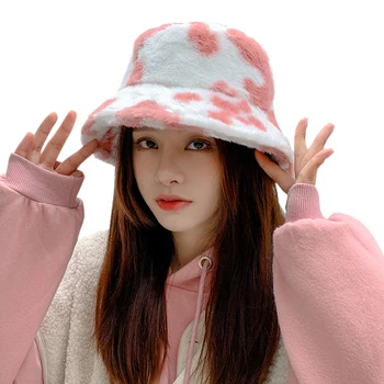 2021 New Fashion Korean Pink Cow Print Bucket Hat Faux Fur Winter Hats For Women Warm Plush Fisherman Caps