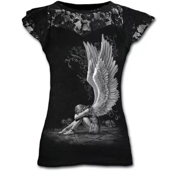 Plus Size Goth Graphic Lace T Shirts for Women Gothic Clothing Black Grunge Punk Tees Ladies Y2k Short Sleeve Tops Summer Tshirt