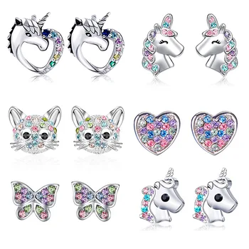 2021 New Fashion Unicorn Cat Butterfly Rainbow Stud Earrings Women Gilrs Colorful Zircon Ear Stud Jewelry Children Accessories